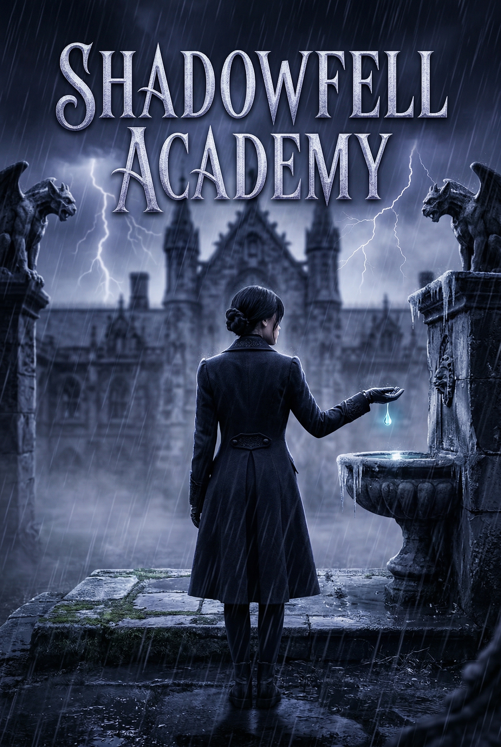 In a city where ancient architecture looms under a perpetually stormy sky, a lone figure stands on a cobblestone bridge, their magical staff glowing with arcane energy. As lightning strikes illuminate a looming clock tower and grotesque gargoyles, they prepare to confront the encroaching darkness that threatens to consume reality itself.
