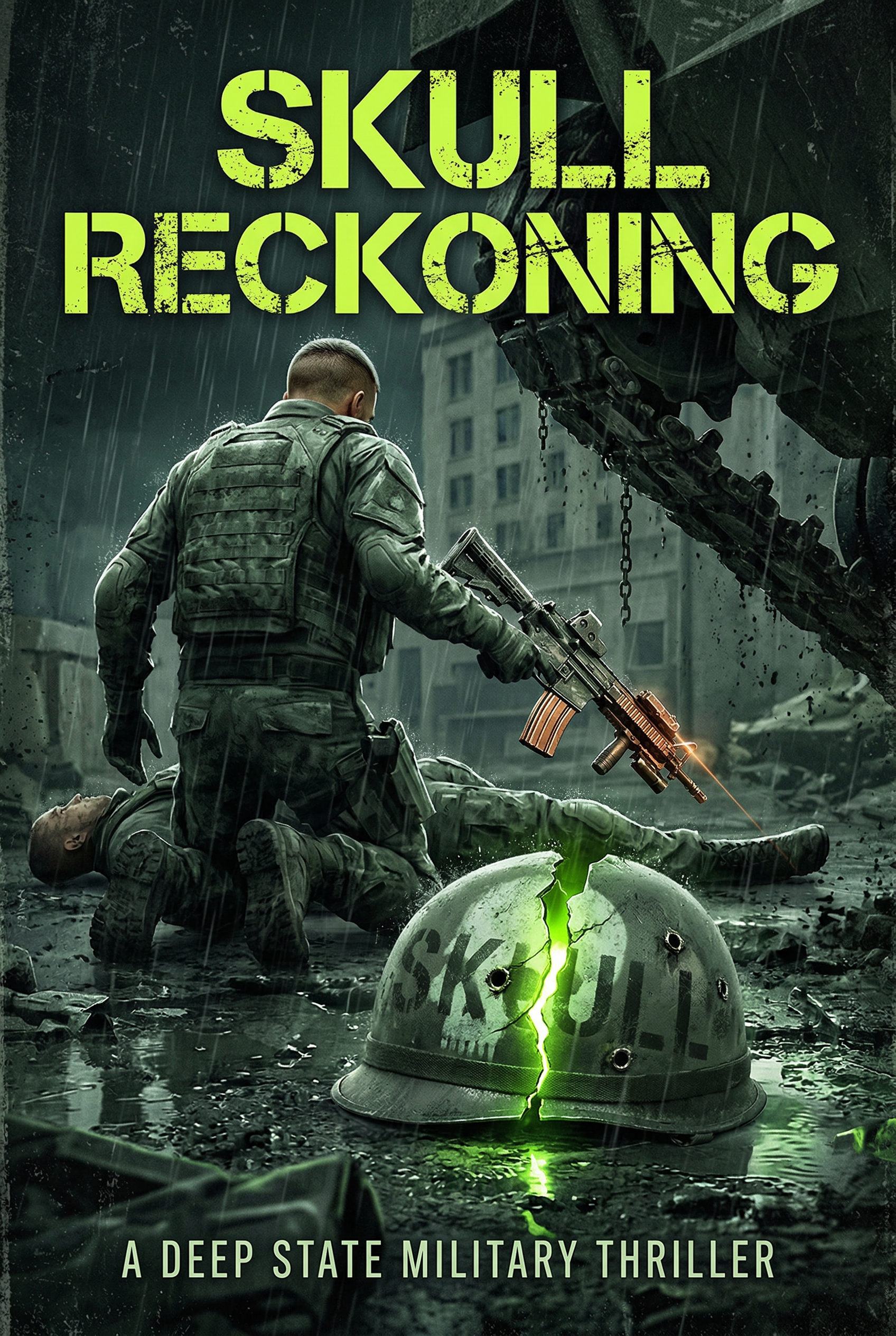 A lone vigilante, scarred by war and loss, emerges from the shadows, his face a skull-like mask of vengeance. Surrounded by barbed wire and spent casings, he weeps tears of blood, a grim Punisher symbol hanging below, ready to unleash a relentless storm of justice upon a corrupt world.