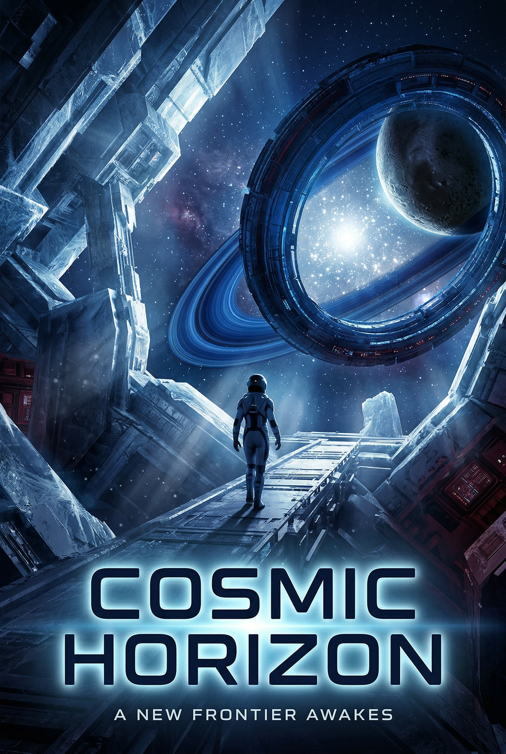 An astronaut stands on a monumental space station, gazing towards a ringed planet and a distant star through a colossal, artificial gateway. This is a journey into the unknown, a quest to unlock the secrets of a new cosmic frontier that promises both wonder and peril.