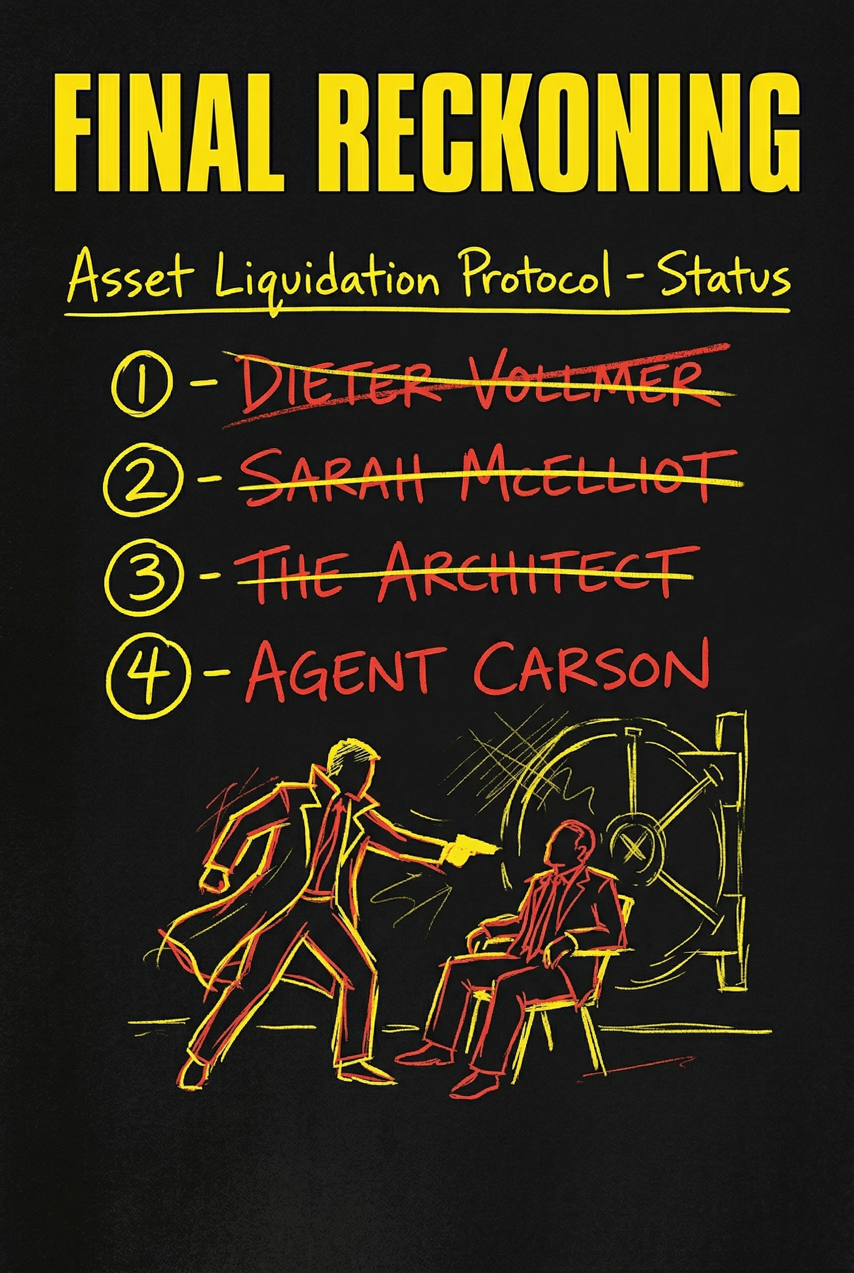 A lone operative, driven by a cryptic 'Asset Liquidation Protocol,' systematically eliminates targets from a chilling hit list. With three names already crossed off, the protagonist now confronts Agent Carson, the final obstacle, in a high-stakes showdown that will decide the fate of a conspiracy, and perhaps, the world.