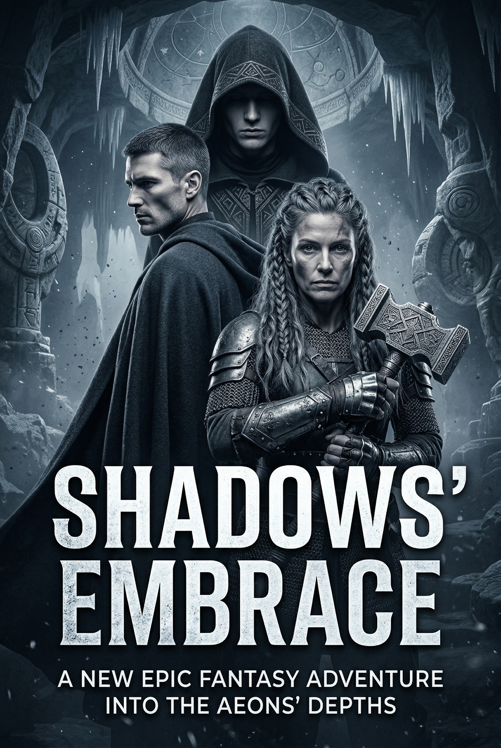 Three grim figures emerge from the shadows of an ancient, icy cavern, their faces etched with determination and hardship. They prepare to delve deeper into forgotten depths, armed with ancient weapons and a shared purpose against an unseen, looming darkness.