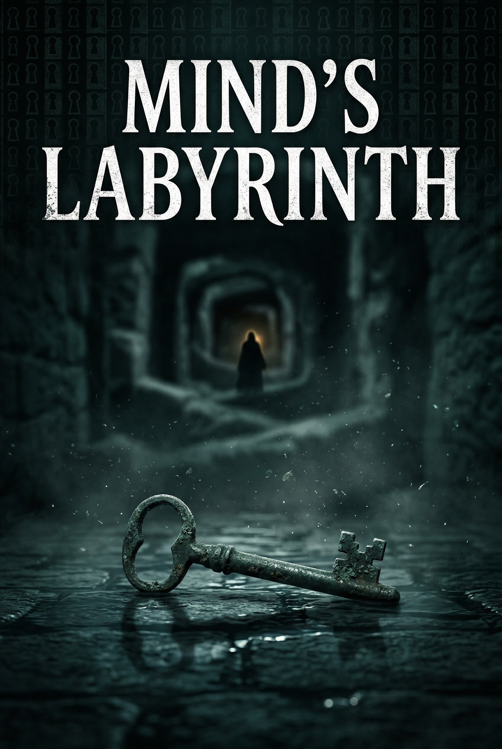 A lone figure stands at the end of a long, dark labyrinth, their path illuminated by an eerie glow. In the foreground, a rusty, ancient key lies on a wet, reflective surface, hinting at a forgotten secret or a locked-away truth. The journey through this mind's maze promises a descent into psychological depths, where every turn holds a new mystery and the key to escape lies buried within.