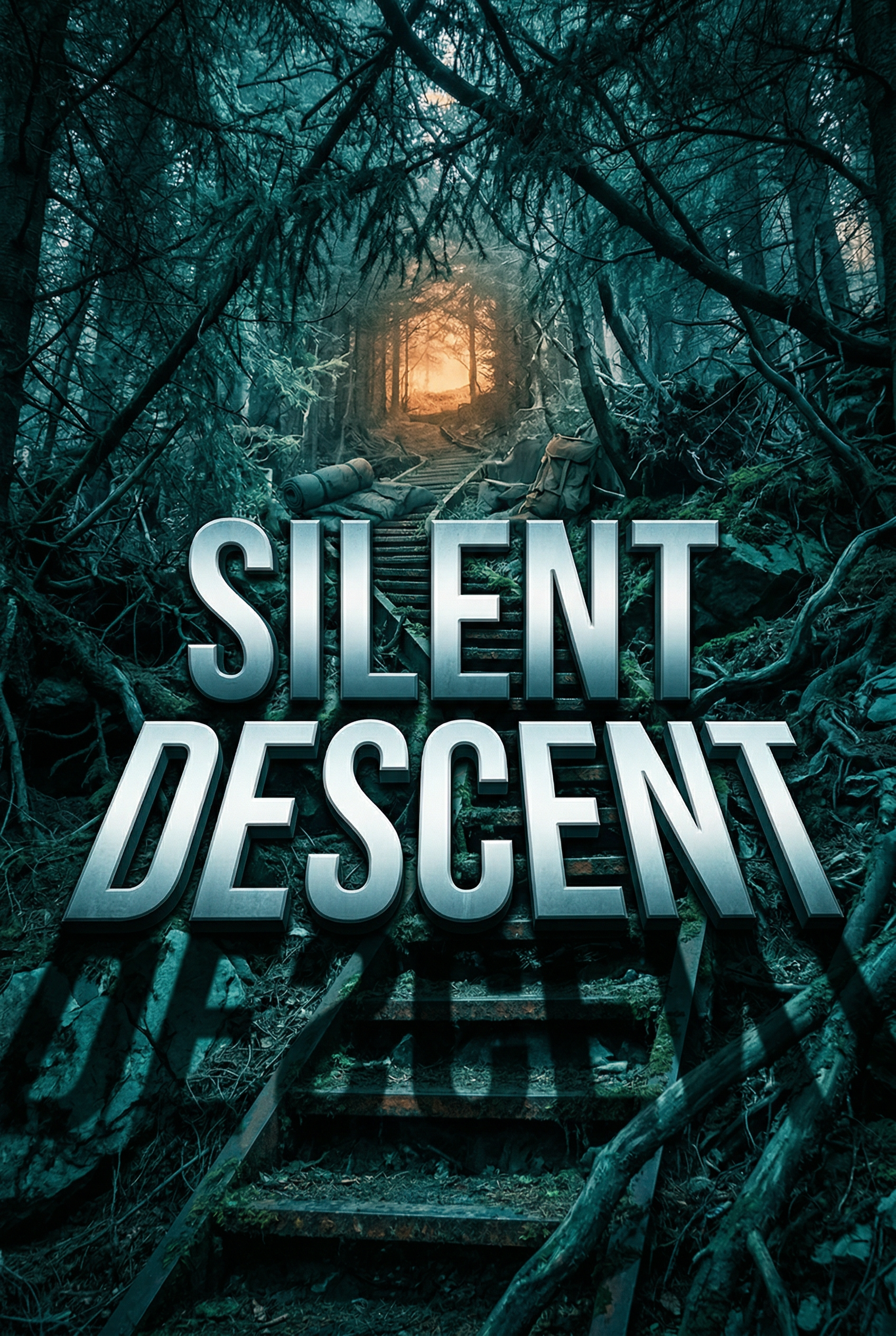 Deep in a tangled, overgrown forest, an abandoned, moss-covered staircase descends into an ominous darkness, barely lit by a distant, unsettling glow. Backpacks and bedrolls litter the steps, hinting at a desperate, silent journey into the unknown. What terrors await those who dare to make this silent descent?