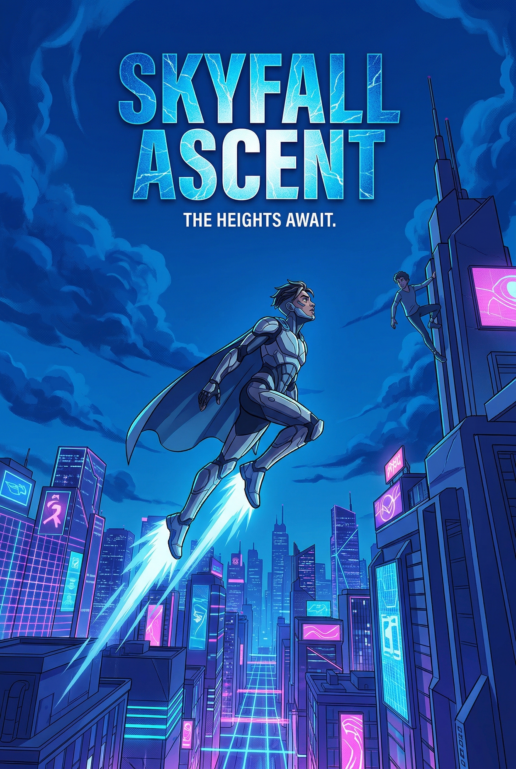 In a neon-drenched metropolis, a hero clad in a sleek suit rockets through the sky, a beacon of hope against the towering structures. Meanwhile, another figure scales a skyscraper, hinting at a world where extraordinary abilities are both a gift and a challenge. As 'Skyfall Ascent' promises, the heights await, demanding courage and power from those who dare to claim them.