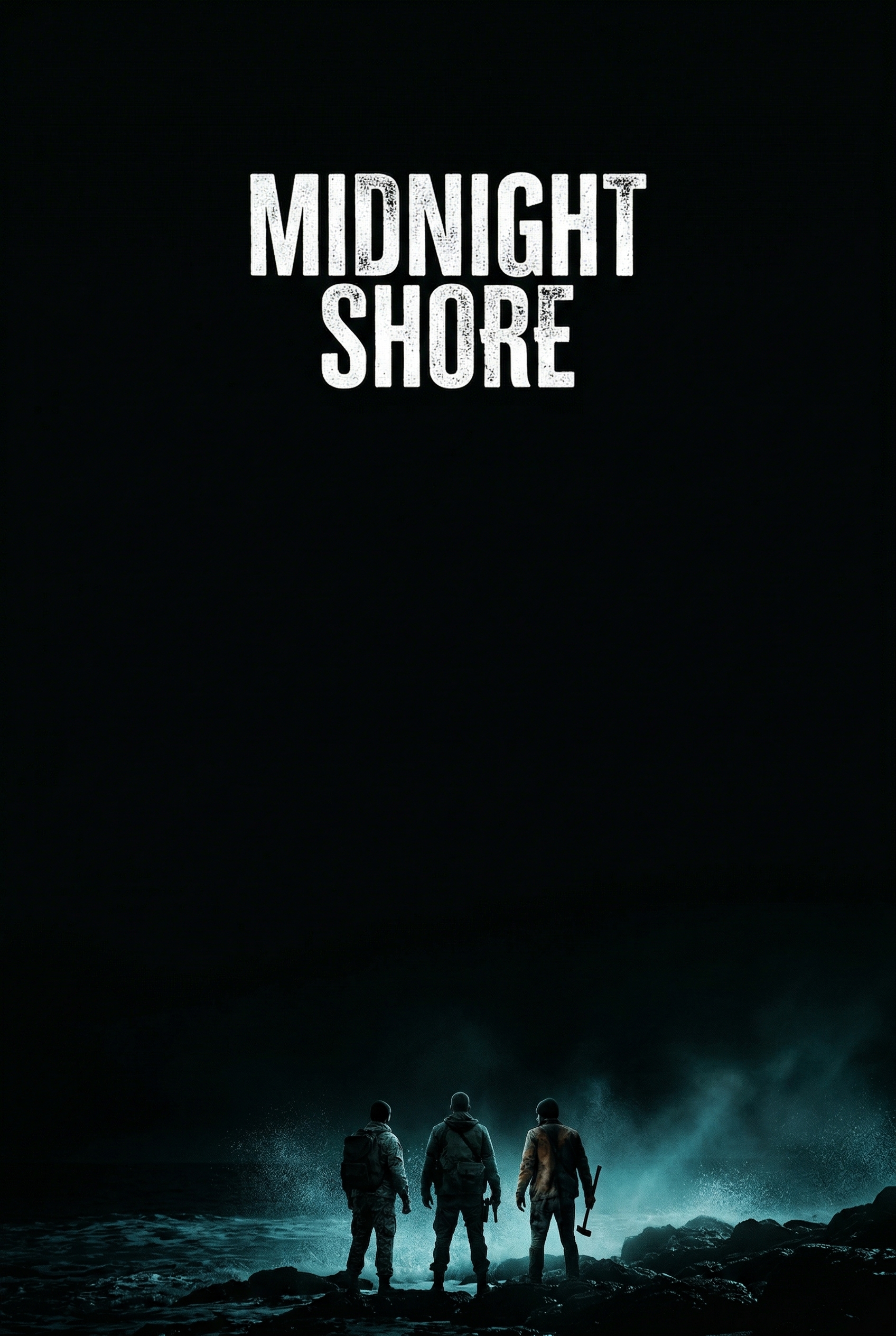 Three figures stand silhouetted against a churning, midnight sea, their backs to us, facing an unknown threat or destination. The stark contrast of their forms against the dark, turbulent water hints at a desperate journey or confrontation under a moonless sky. They are armed, suggesting a fight for survival against overwhelming odds at the edge of the world.