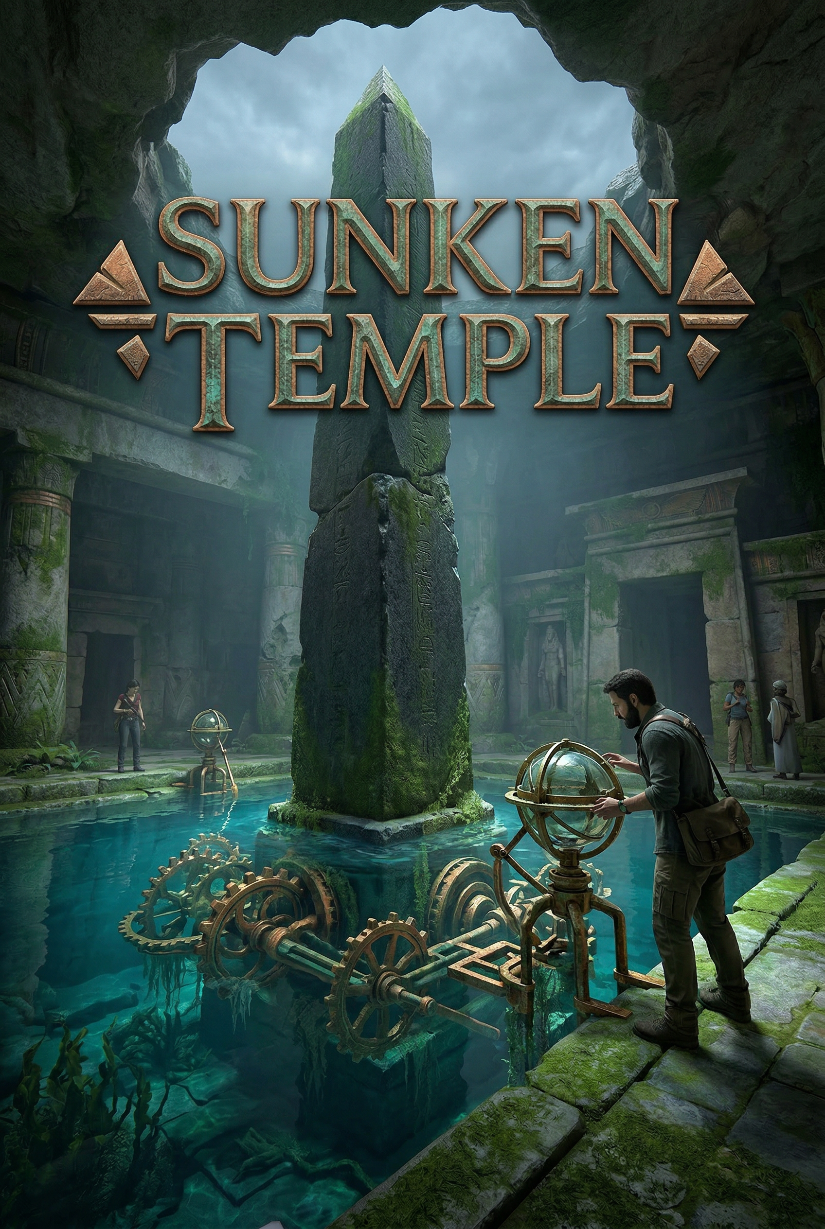 Deep within a forgotten, moss-covered temple, an intrepid explorer uncovers ancient, intricate machinery submerged in crystal-clear waters. As he manipulates a strange celestial sphere, the secrets of a lost civilization begin to stir, promising untold wonders or unforeseen dangers.