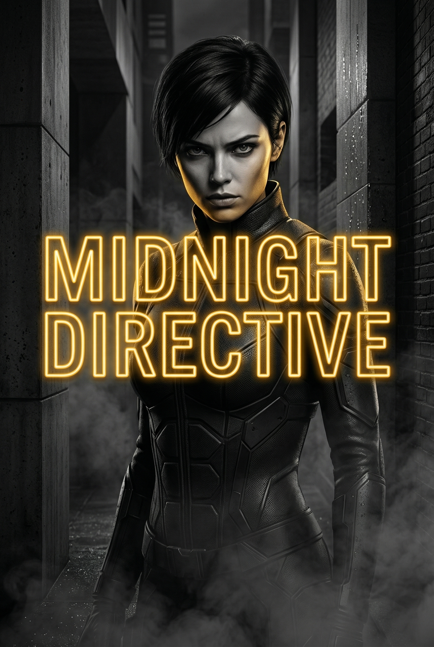 A formidable operative stands ready in a rain-slicked, shadowy alley, her gaze sharp and determined. She's on a mission under the cover of darkness, where every shadow holds a secret and every decision could mean life or death. The city holds its breath, awaiting her next move under the 'Midnight Directive'.