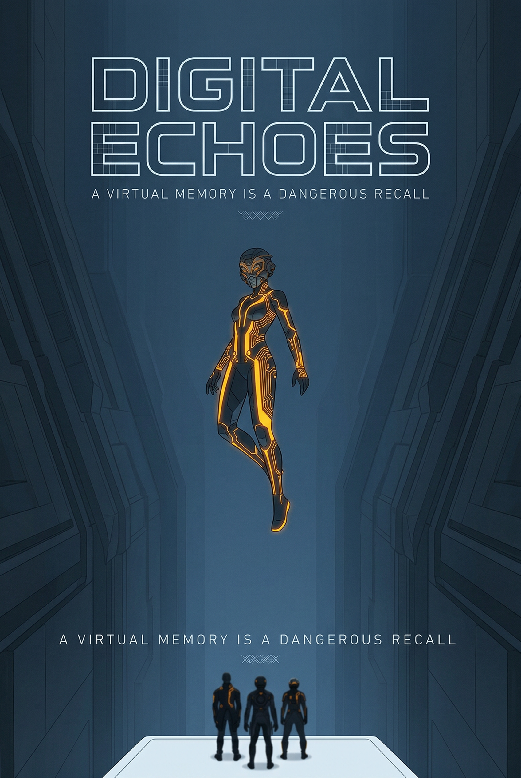 In a sprawling digital realm, a lone figure in a glowing suit floats above, a ghost of the past. Below, three others gaze up, ready to confront the echoes of a virtual memory that threatens to unravel their present. As the lines between reality and simulation blur, they must navigate a dangerous recall to survive.