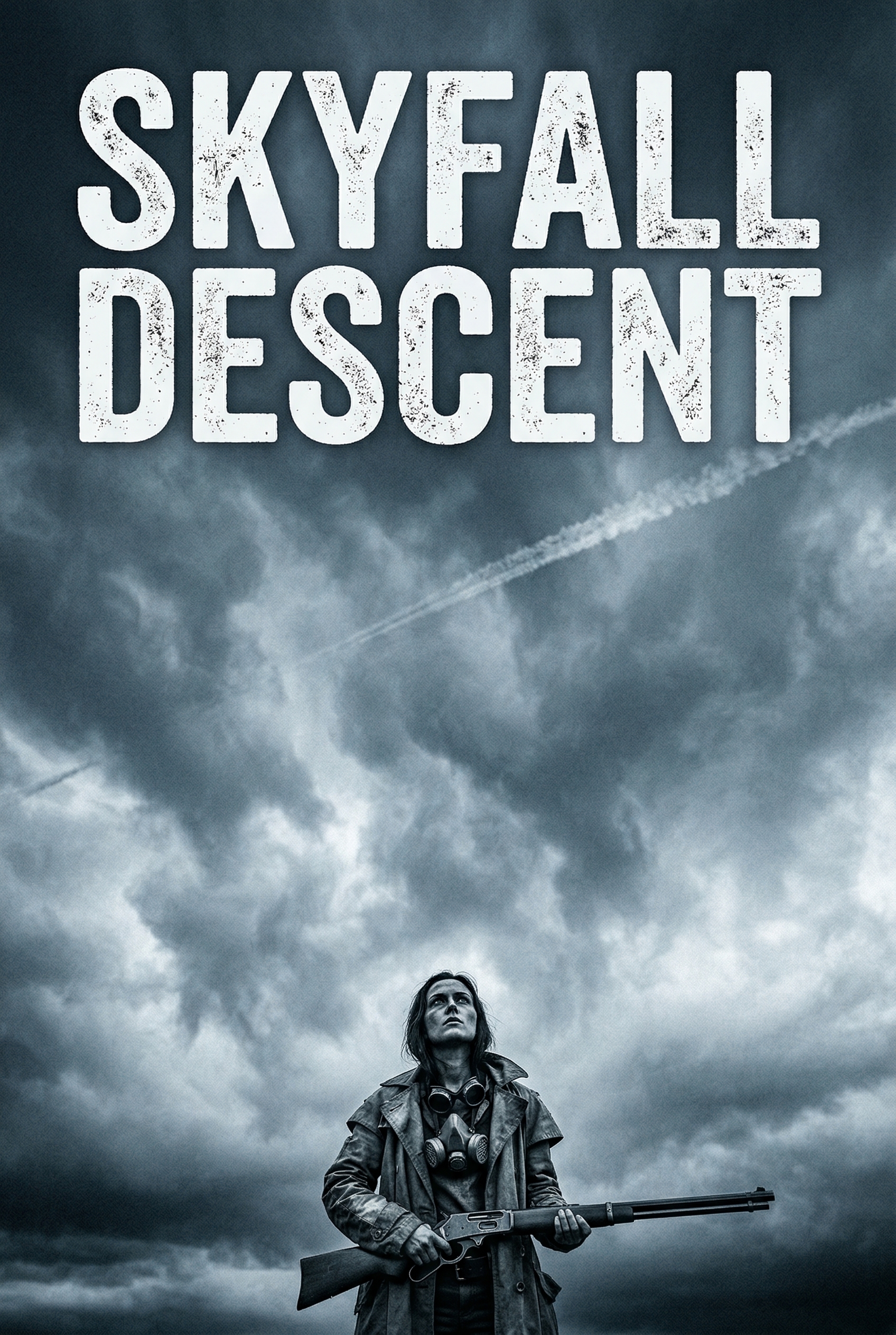 A lone survivor, clad in tattered gear and a gas mask, stands resolute against a vast, tumultuous sky. With a rifle clutched in her hand, she gazes upwards, perhaps searching for hope or bracing for the next threat in a world scarred by an unknown cataclysm. The very air seems to whisper of past devastation and an uncertain future.