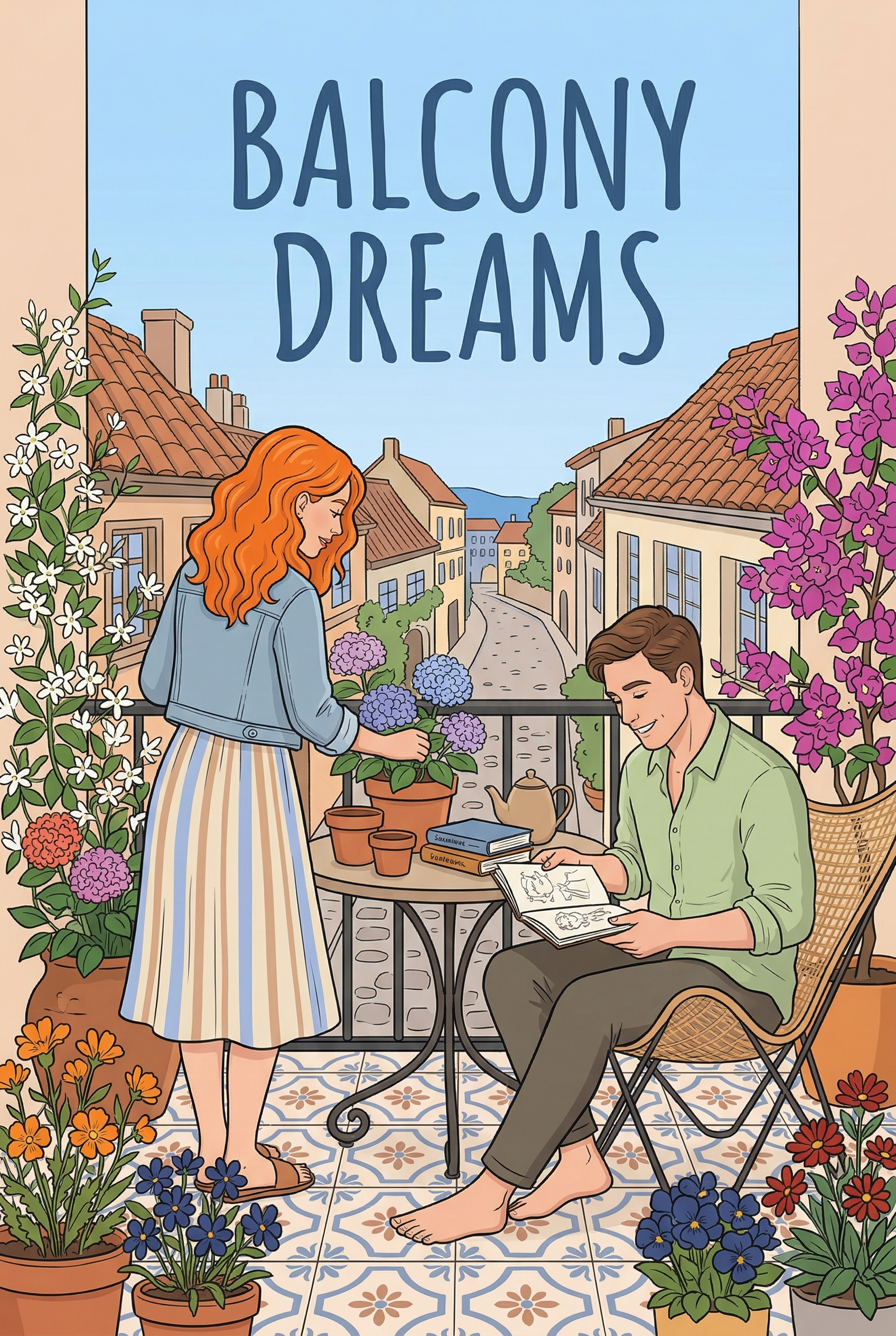 A young woman tends to her vibrant balcony garden, while her partner sketches contentedly beside her, both enjoying a peaceful afternoon overlooking a picturesque European town. Their shared quiet moments on the sun-drenched balcony hint at a blossoming romance and the simple joys of building a life together.