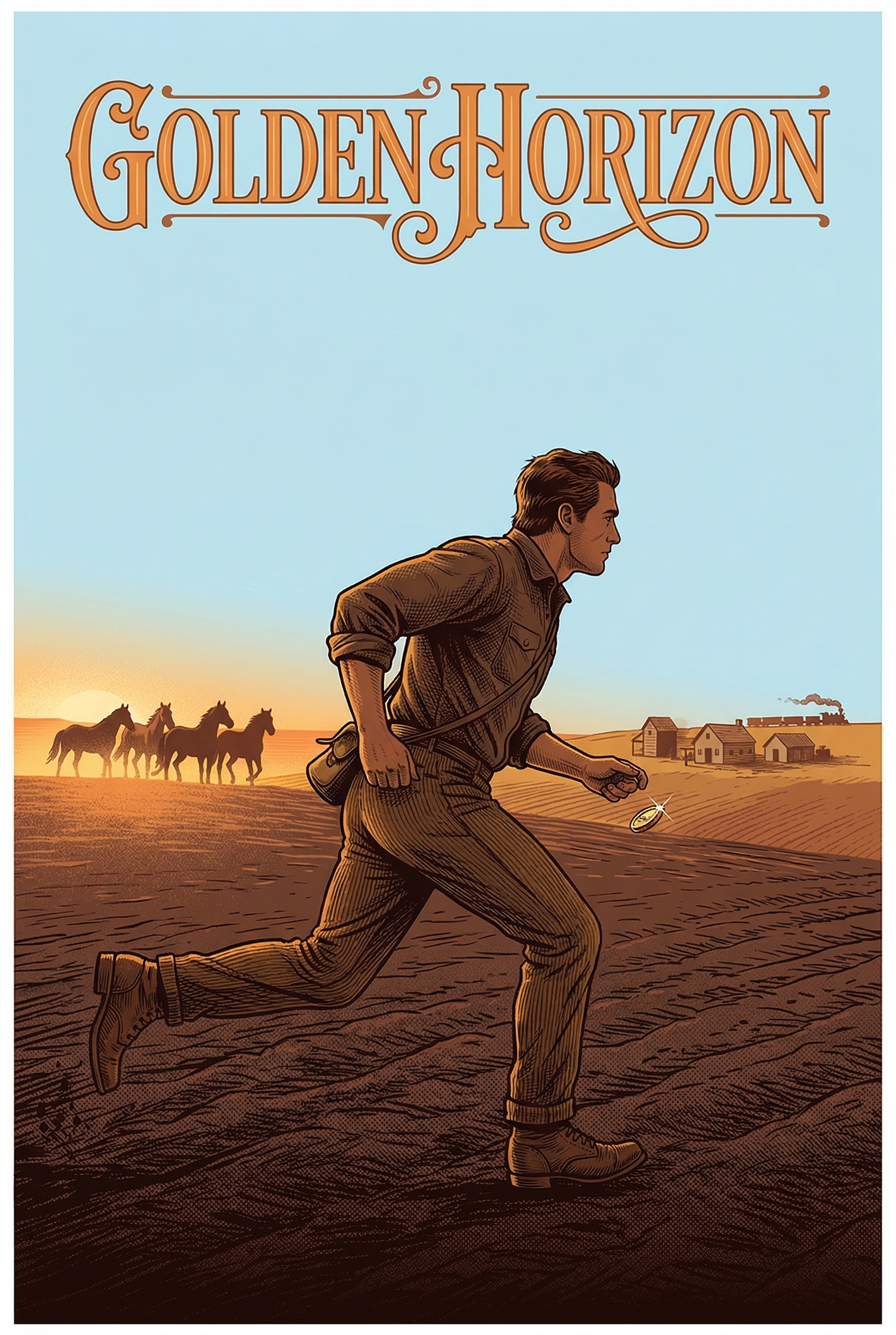 A lone prospector, guided by a glinting coin, races across the vast, untamed frontier towards a burgeoning settlement. As the sun sets on the horizon, wild horses gallop in the distance, embodying the untamed spirit of the land he seeks to claim, hinting at the promise and perils of a new beginning.