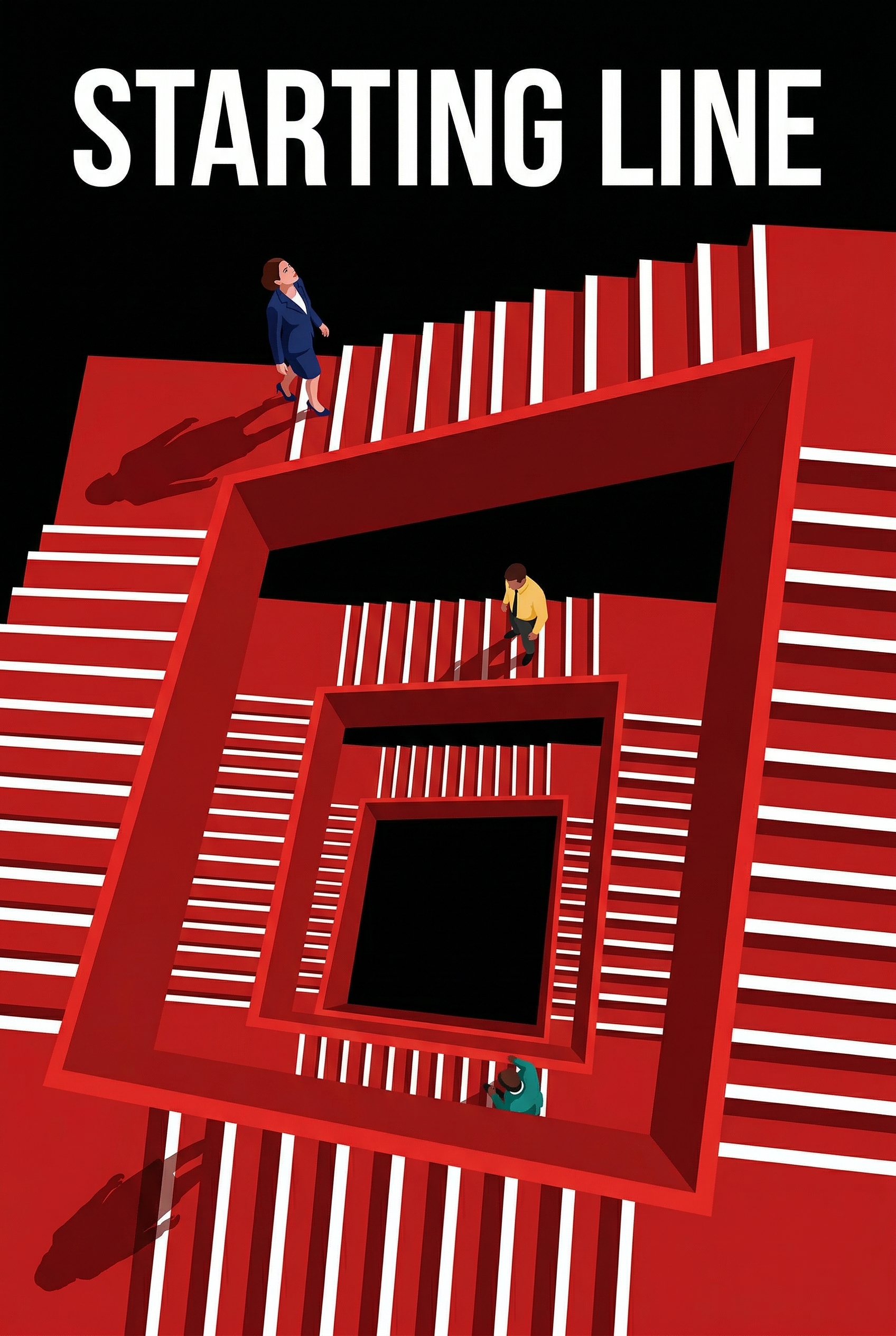 Three individuals navigate a complex, red-hued labyrinth of stairs, each at a different stage of their journey. The seemingly endless climb and descent suggest the intricate and often solitary path to success, or perhaps the multiple starting lines one faces in life.