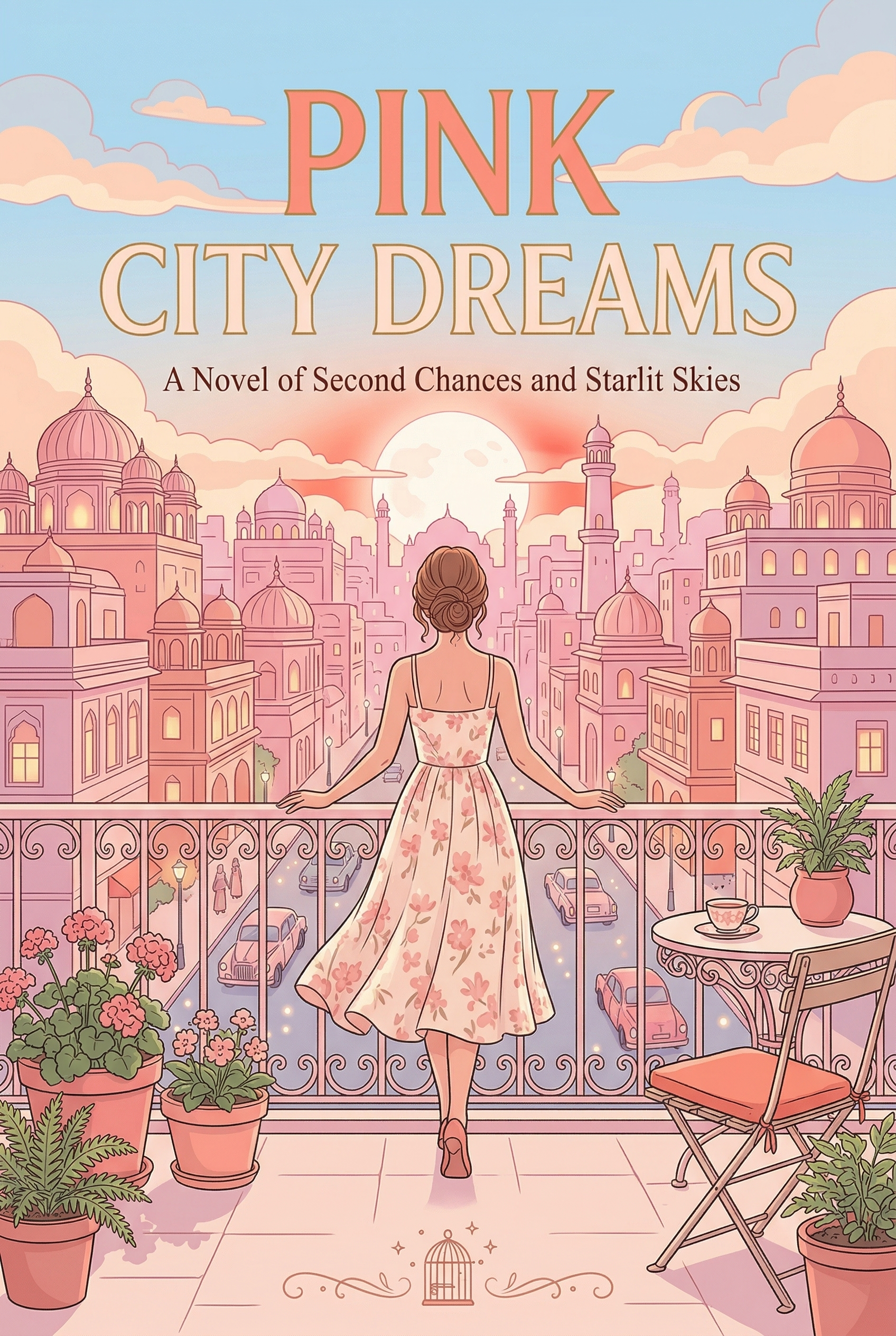A young woman, having shed the burdens of her past, stands on a balcony overlooking a city bathed in the rosy hues of sunset. She gazes out at the sprawling, dreamlike cityscape, ready to embrace new beginnings and find love under the starlit skies, hoping for a second chance at happiness.
