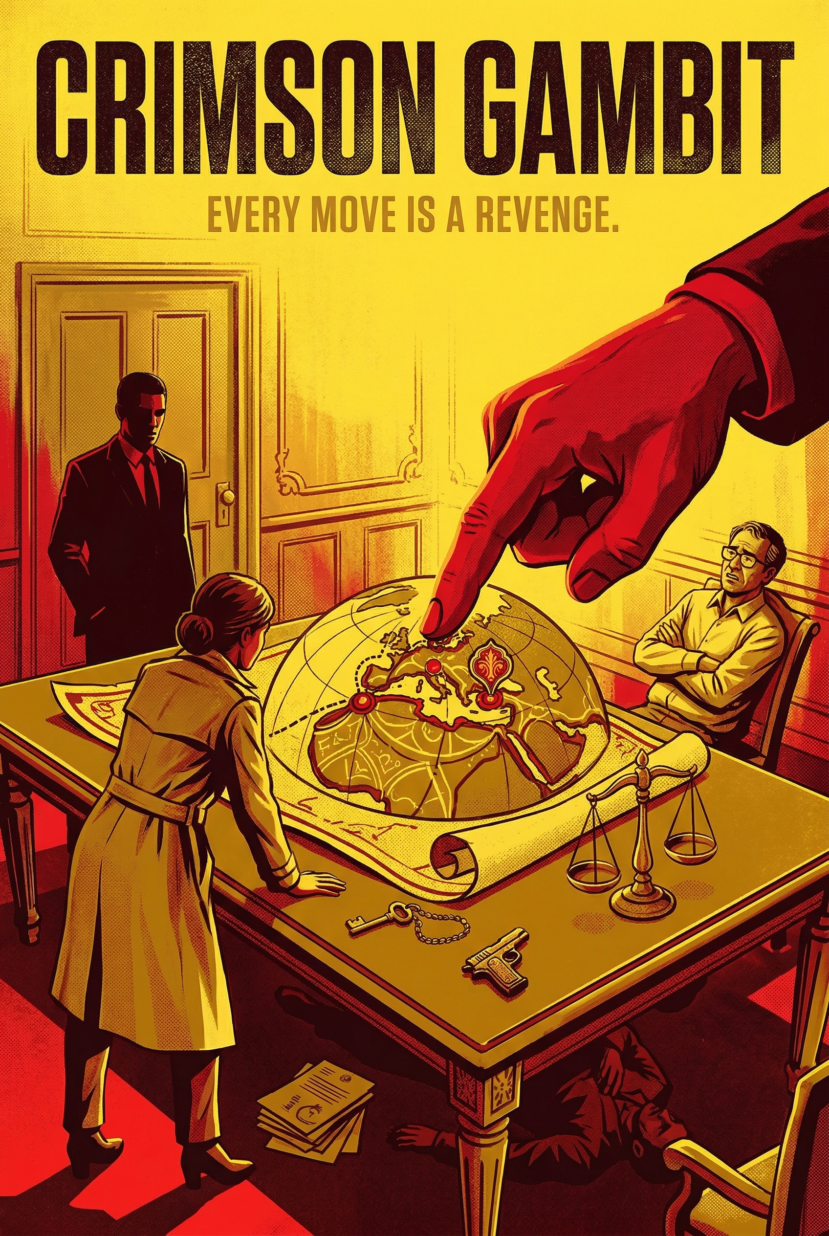 A looming red hand dictates the fate of nations on a global map, as a trench-coated figure and a suited man observe the unfolding geopolitical game. On the table, a gun, a key, and scales of justice hint at the high stakes, while a body lies hidden beneath, revealing the deadly consequences of every strategic move.