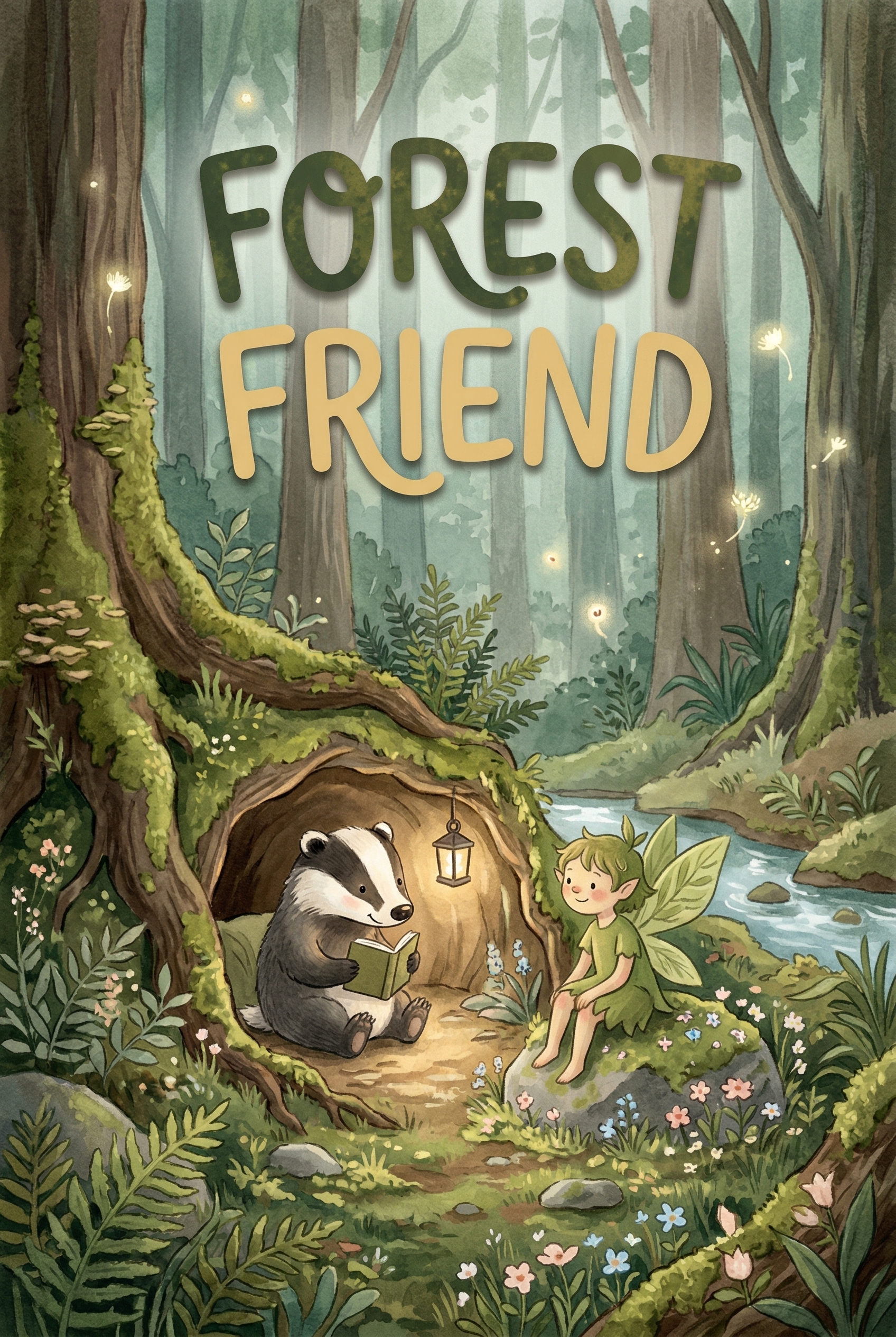 Deep within an enchanted forest, a studious badger reads by lantern light in his cozy tree-root home. Outside, a gentle fairy friend listens intently by a flowing stream, surrounded by delicate wildflowers and glowing fireflies. It's a tale of quiet companionship and the magic found in the heart of nature.
