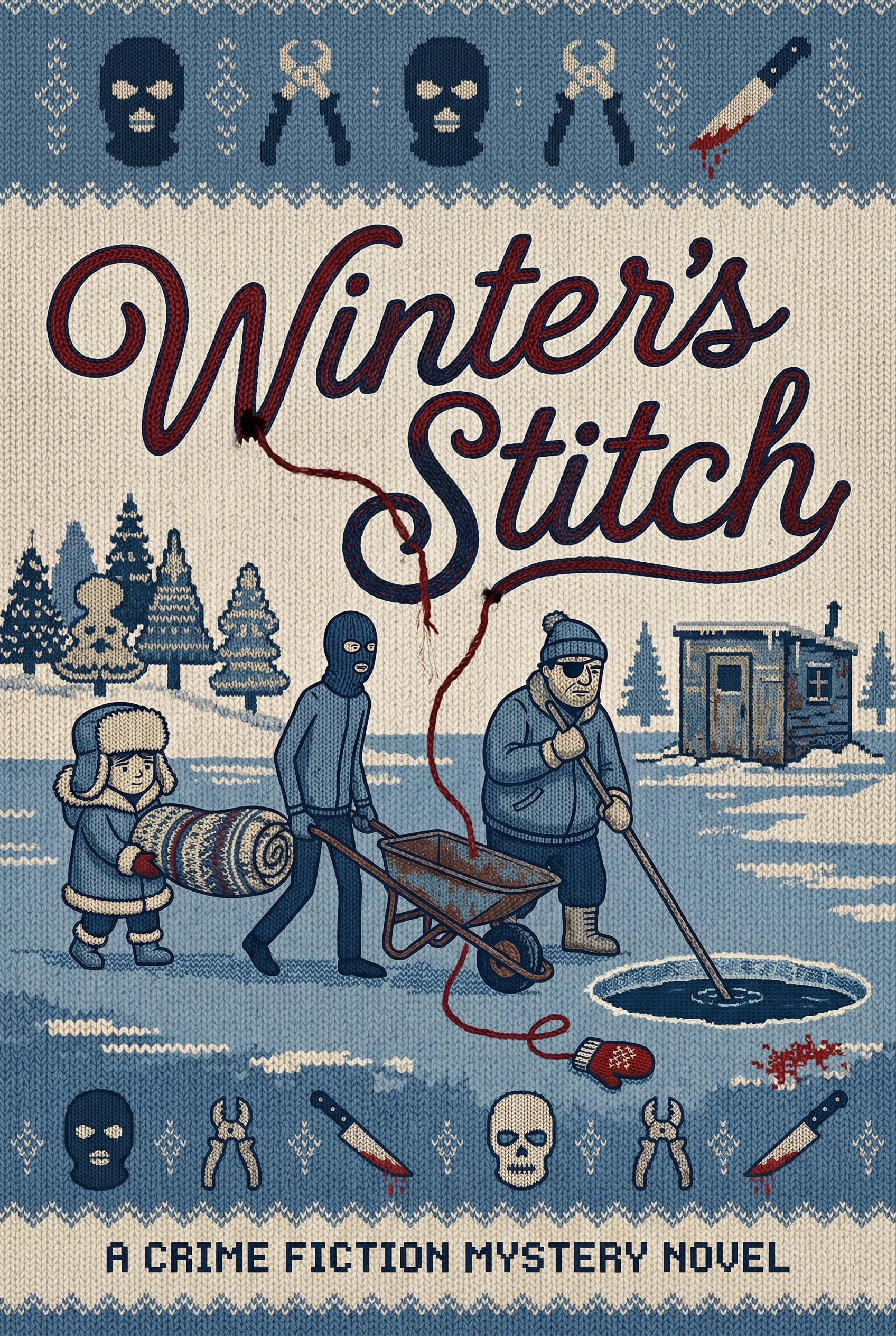 In the desolate, snowy landscape, a motley crew attempts to dispose of a body through a hole in the ice, their grim task disguised by the innocent, cozy aesthetic of a winter sweater. As the 'stitch' unravels, the dark secrets of a small town begin to surface, revealing a chilling tale of murder and unexpected camaraderie.