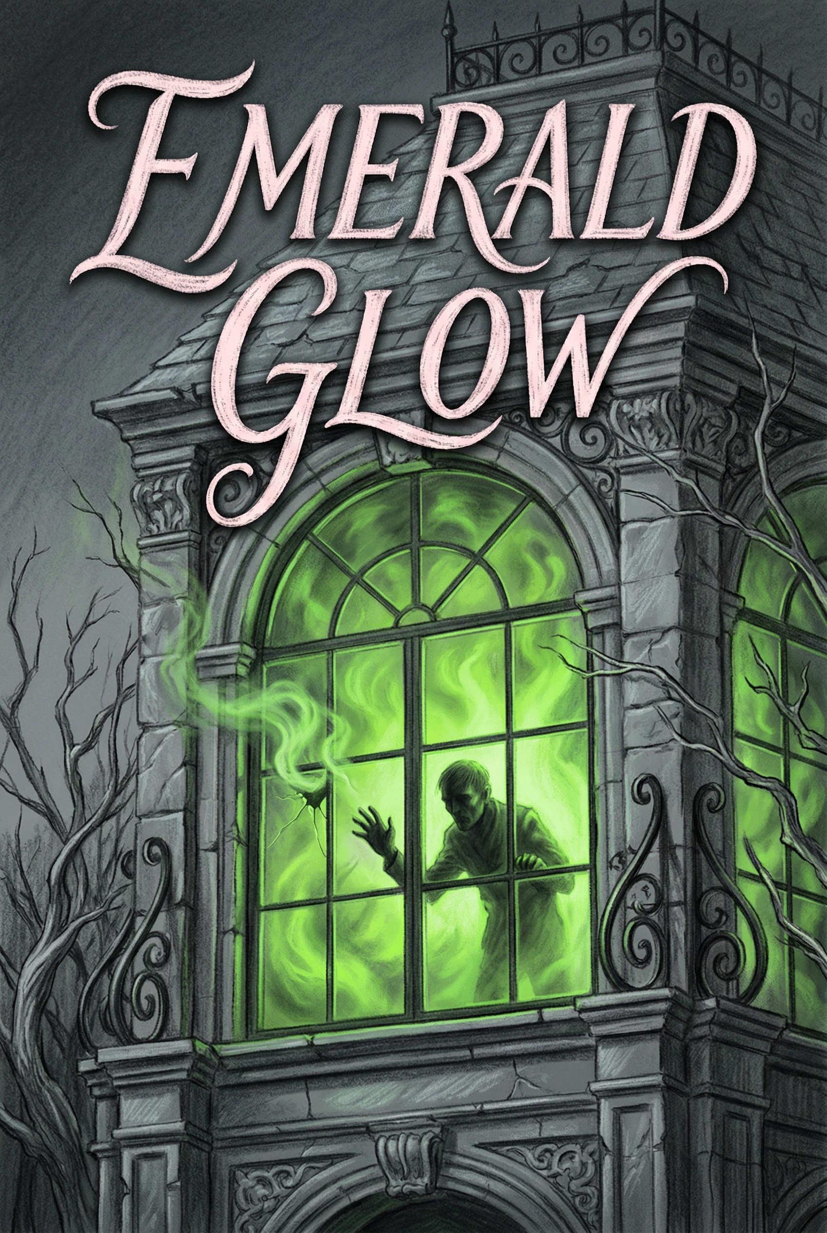 Within the crumbling walls of a forgotten mansion, a spectral figure is trapped, desperately reaching out from behind a window engulfed in an ominous emerald glow. As the eerie light seeps into the night, it beckons those who dare to uncover the dark secrets held within its haunted embrace.
