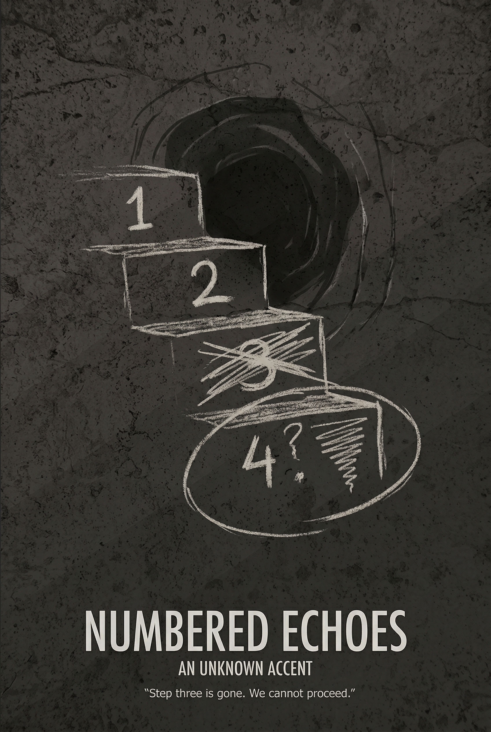 A dark, textured wall reveals a chalk drawing of a staircase leading into a void. Steps one and two are clear, but step three is violently X'd out, leaving a question mark and a swirling abyss for step four. The chilling quote, 'Step three is gone. We cannot proceed,' hints at a path irrevocably altered and a journey into the unknown.