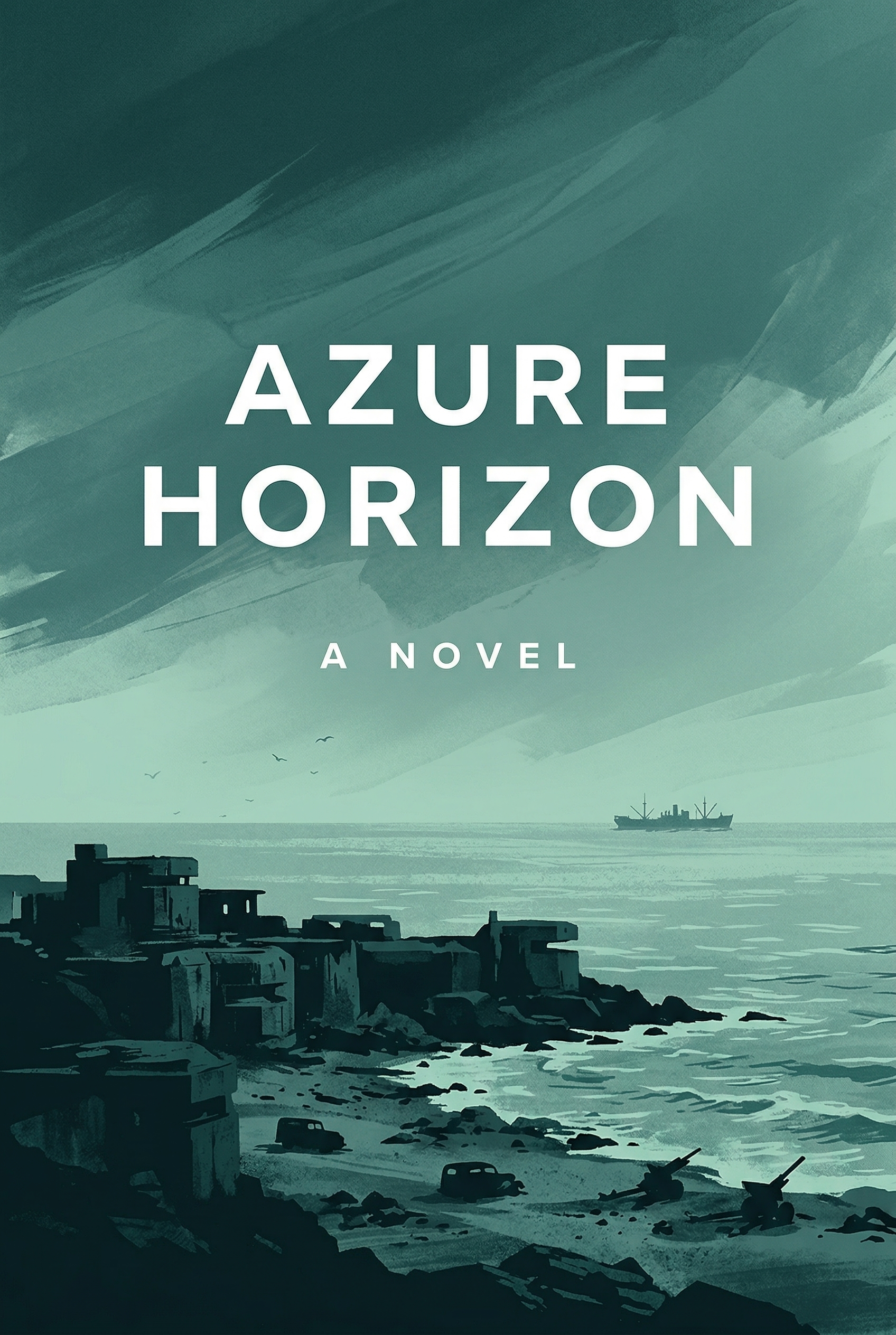 Along a desolate, fortified coastline, forgotten bunkers and abandoned vehicles hint at a past conflict. A lone ship sails on the horizon, shrouded in a muted, somber atmosphere, suggesting untold stories of resilience and the enduring impact of war.